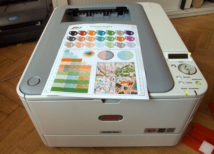 Khi trống lăm qua bề mặt giấy in, nội dung cần in được truyền lên giấy. In laser sử dụng mực dạng bột. Bột mực được nấu chảy khi tờ giấy đi qua trục sấy với nhiệt độ khoảng 260 độ C và cùng với lực ép của trục sáy mực in nóng chảy sẽ bám chặt lên mặt giấy. In laser màu cũng có nguyên lý như in laser đen trắng nhưng thay vì 1 hộp mực đen trắng; nó sẽ có thêm các hộp mực màu cơ bản: đen, vàng, magenta và cyan.