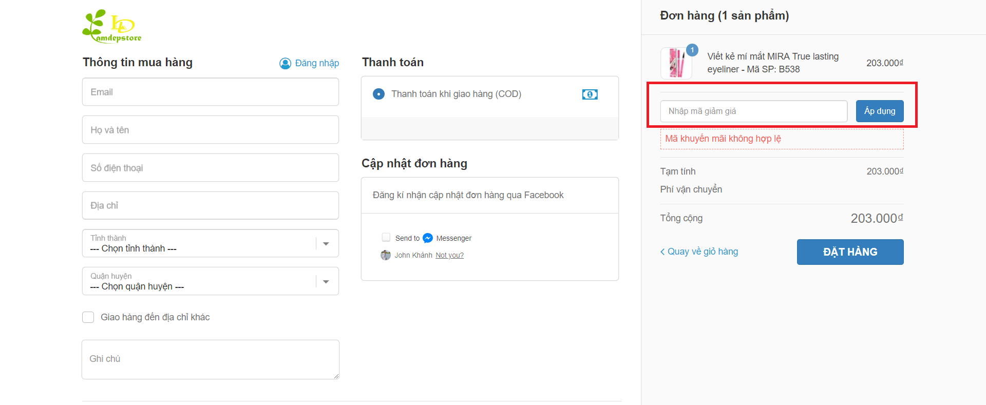 ⭐ Nhập mã khuyến mãi tại ô màu đỏ ở phần Đơn hàng như trong hình sau: